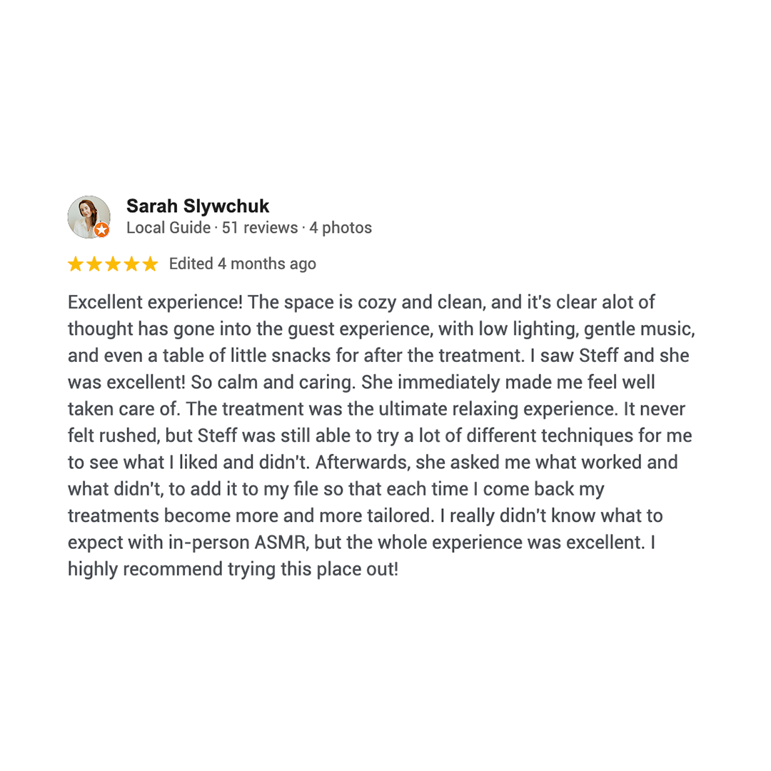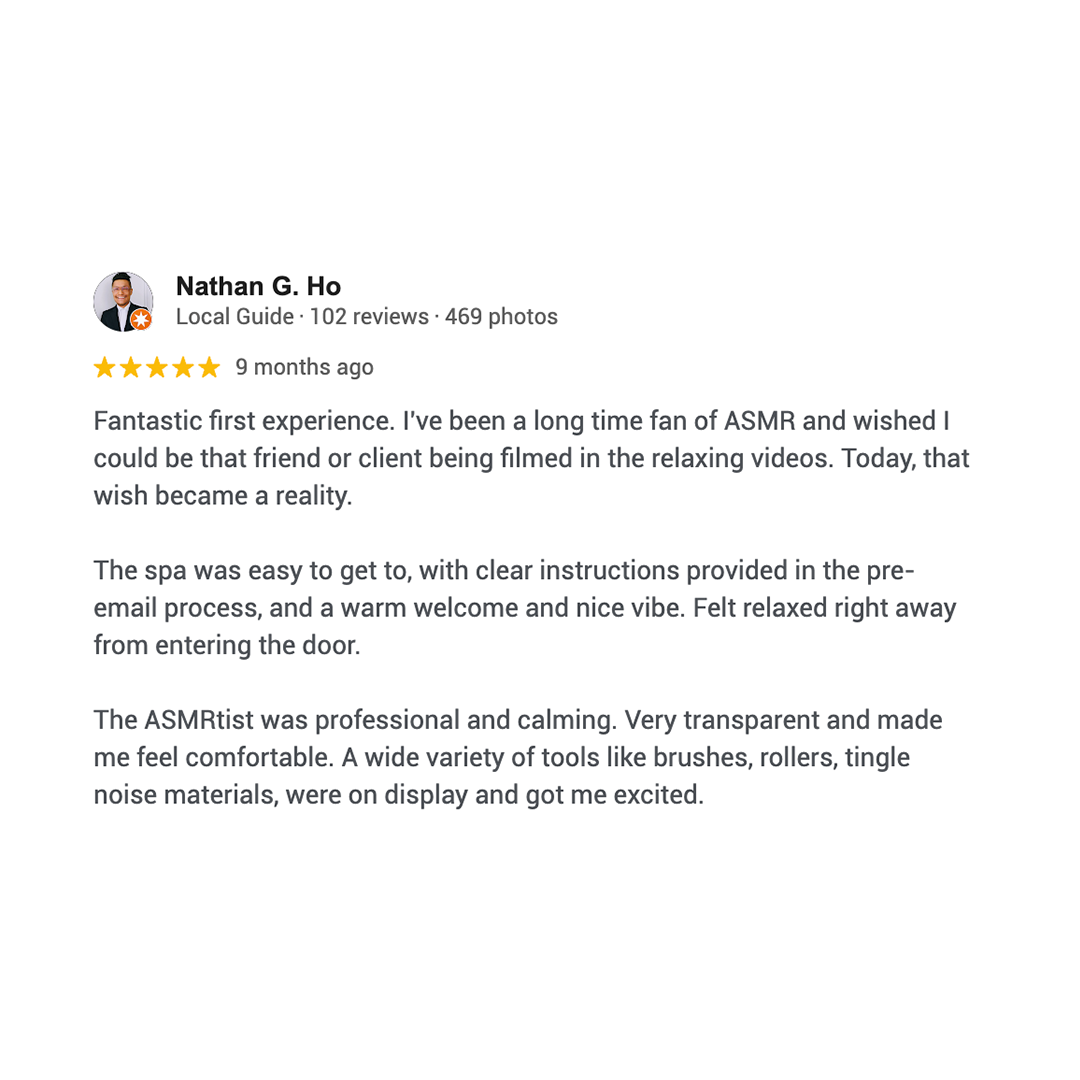 Your ASMRtist will perform your service featuring a variety of body tools, techniques, sounds, scents, and other ASMR-inspired triggers for a calming, immersive experience. You just lay back, relax, and receive.