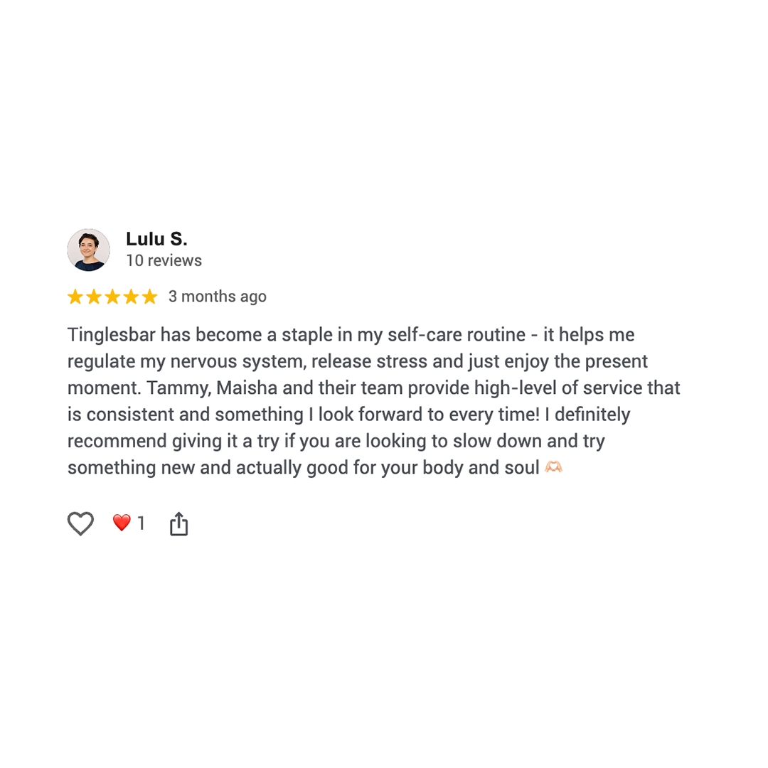 A Note on Safety & Boundaries: tinglesbar is a strictly platonic sanctuary with a zero-tolerance policy. We work exclusively on the head, face, arms, and back (no chest or areas below the waist) to ensure a safe, professional environment for both our guests and our artists.